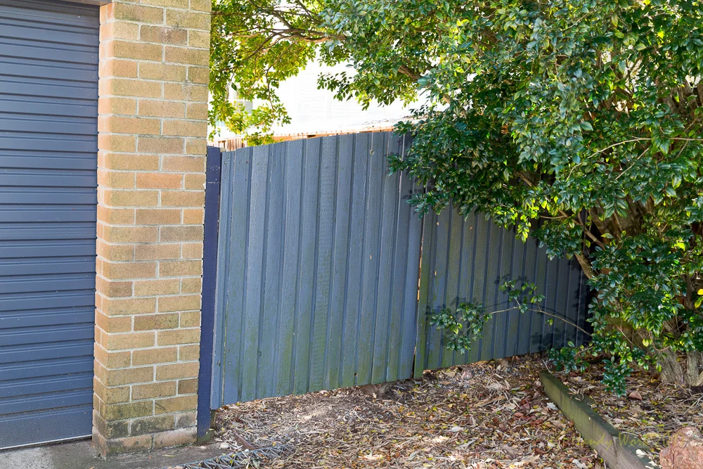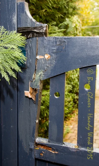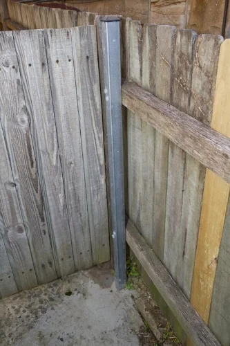 The fence posts had rotted enough for the fence to lean over and the gate was rubbing against the house so hard that it was gauging out chunks of timber. As the fence was in generally good repair, rather than replace the fence an additional metal fence post was concreted in so the fence remained upright and therefore stopped further damage to the house.