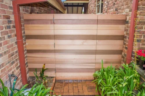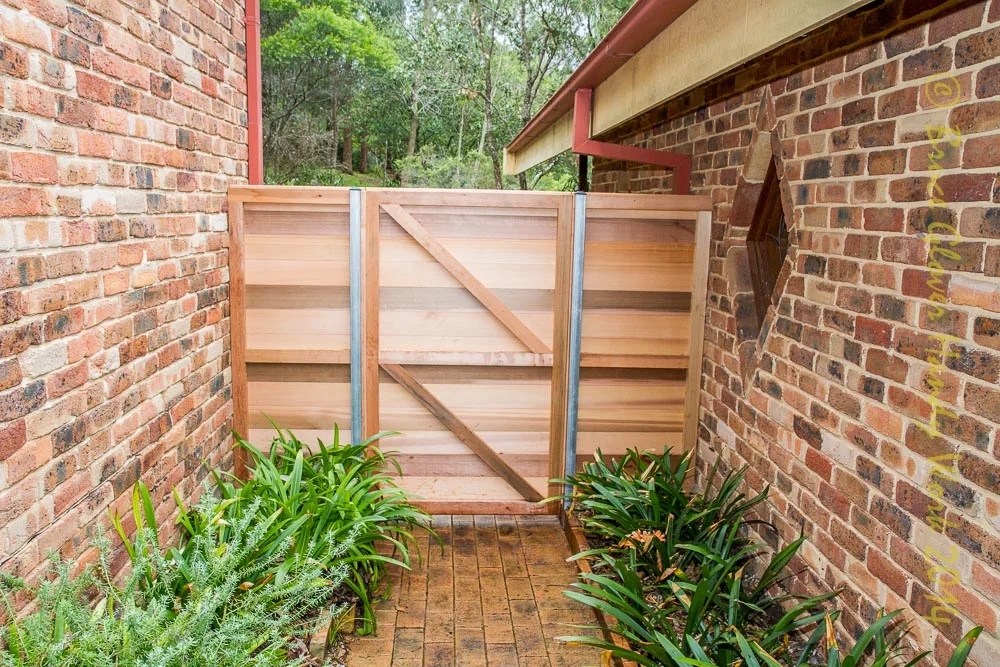 Pavers were lifted, steel posts concreted in and cedar paneling was custom made to ensure a long life and the aesthetic requirements of the discerning client, including special self closing hidden hinges and a push latch without any handles, so the elegant nature was maintained while easy to use, without the dog getting out. Later Handy Work applied Sikens Primer and two finish coats to protect the valuable timber from the weather.