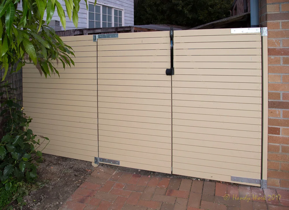 Materials will vary depending on the client's architectural and environmental preferences, but Handy Work will recommend materials that last, including treated pine (both the painted kind and the yellow/green CCA kind of treated pine), hardwood and cedar. Handy Work will only use stainless steel or galvanised fixings that will stand the test of time and weather. Mostly we recommend magnetic latches to ensure long-term trouble free closing. We also install steel and aluminium fencing gates and can project manage the fabrication of galvanised steel or stainless steel gates for you.