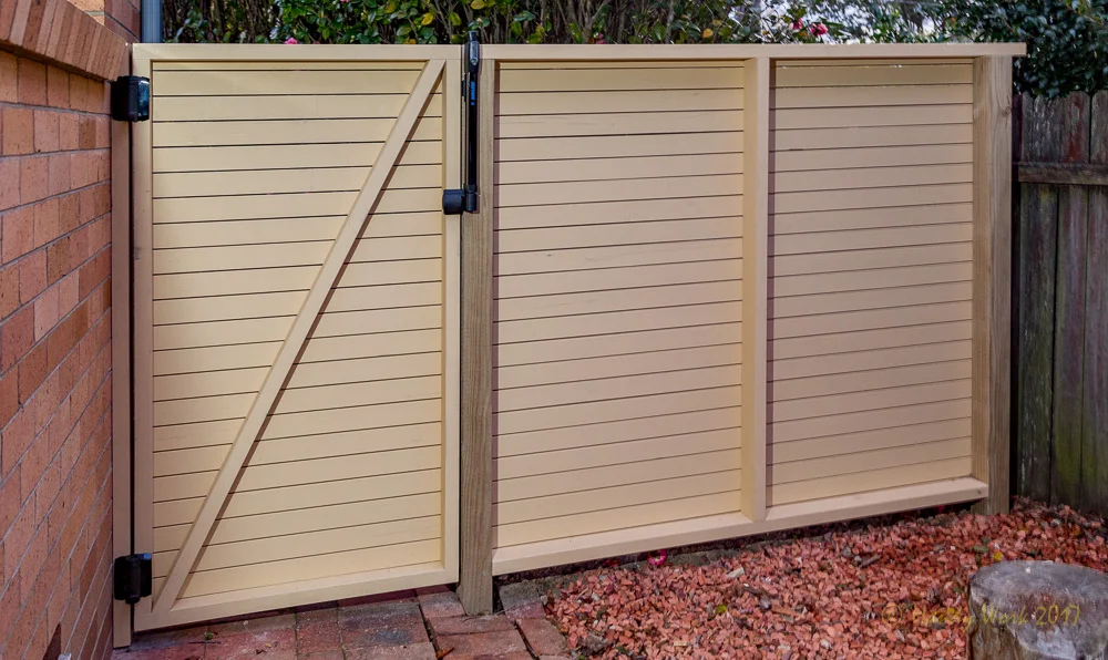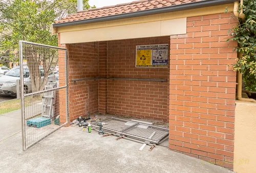 A residential Strata building found that neighbours were constantly putting their garbage in the Strata's bin, leaving no room for the resident's own garbage. Nothing seemed to dissuade the neighbours from their selfish behaviour, so the strata had Handy Work install specially fabricated stainless steel gates to the garbage shed. The engineer who designed the gates specified an electrically operated magnetic latching system which was released by the normal front door key to the strata building entry door.