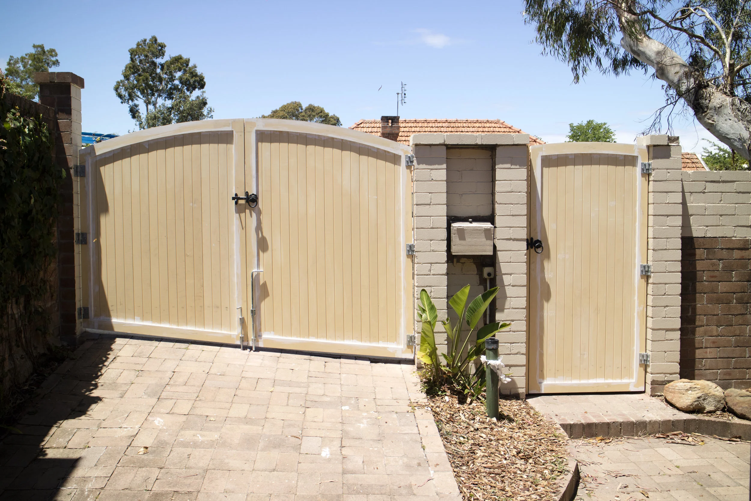 A busy road in Mosman dictated privacy gates across the drive and a pedestrian gate to cut back noise primarily. The client had specific ideas for a design, which due to the drive sloping across the opening and curved top meant the very much bespoke gates needed to be made onsite to ensure they matched the slope entirely. The frame was made and routed out for the paneling and the curved top to the frame was made from very wide pieces of treated pine. The client later on painted the gates themselves.