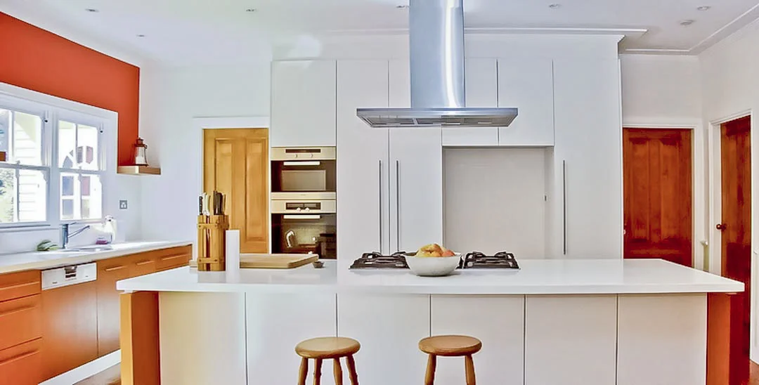 Work included fitting a supporting 6.5m beam into the ceiling so the original enclosed kitchen's walls could be removed making it a more modern open plan kitchen, the timber floor was patched to look natural, the old kitchen demolished, project managed the manufacture and installation of the new kitchen cabinets, electrical and plumbing work. Handy Work installed all the appliances, the range-hood and the sink, fitted new architraves, timber paneling, skirtings and new doors, painted the feature walls, installed new sliding doors to the deck, made and fitted bracket-less shelves to match the kitchen design as well as cabinets in the living room to match.