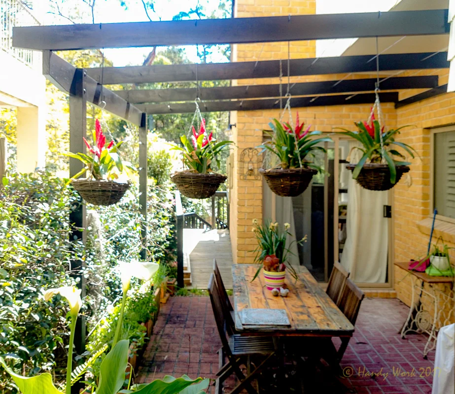 In this particular case, a canopy of greenery was chosen to give privacy from the neighbours who looked down on the area. So a pergola was built and wire was strung through holes in the pergola beams and the support posts to train climbers on.