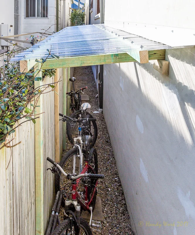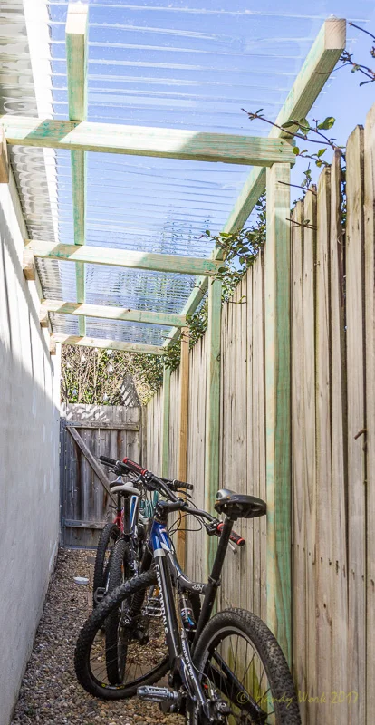 Like more and more homes in Sydney the space to store things was at a premium. The bikes were sitting in the yard, rusting so Handy work built a lightweight pergola-like structure between the fence and the wall of the house and put a clear poly-carbonate roof on it, to maintain the light airy feel.