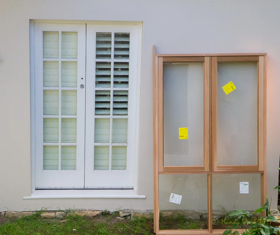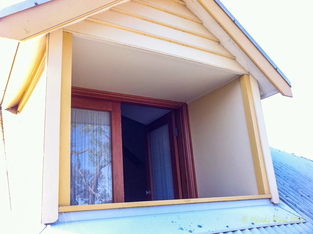 This quaint old home had a lovely little balcony with French Doors onto it from the master bedroom but the owners wanted to have an additional window unit to cut down road noise and to lessen the water on the balcony tiles during inclement weather. Handy Work had a window made to order and installed it for them, after the owners painted it themselves (to save money).